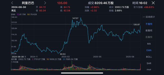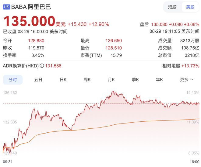 截至8月29日美股收盘,阿里股价上涨近13%,报135美元(约合人民币963元)/股;市值达3218亿美元(约合人民币22949亿元),再破3000亿美元大关。